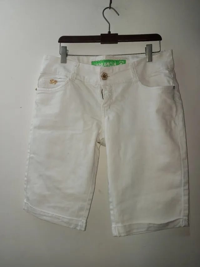 Bermuda branca G marca Drnuncia, com botão Pérola com pedrinhas com brilho. Bolsos atrás e na frente com barra viradinha um pouco acima do joelho. Retirar próximo ao Shopping Interlagos zona Sul SP entrego tb no shopping Interlagos.