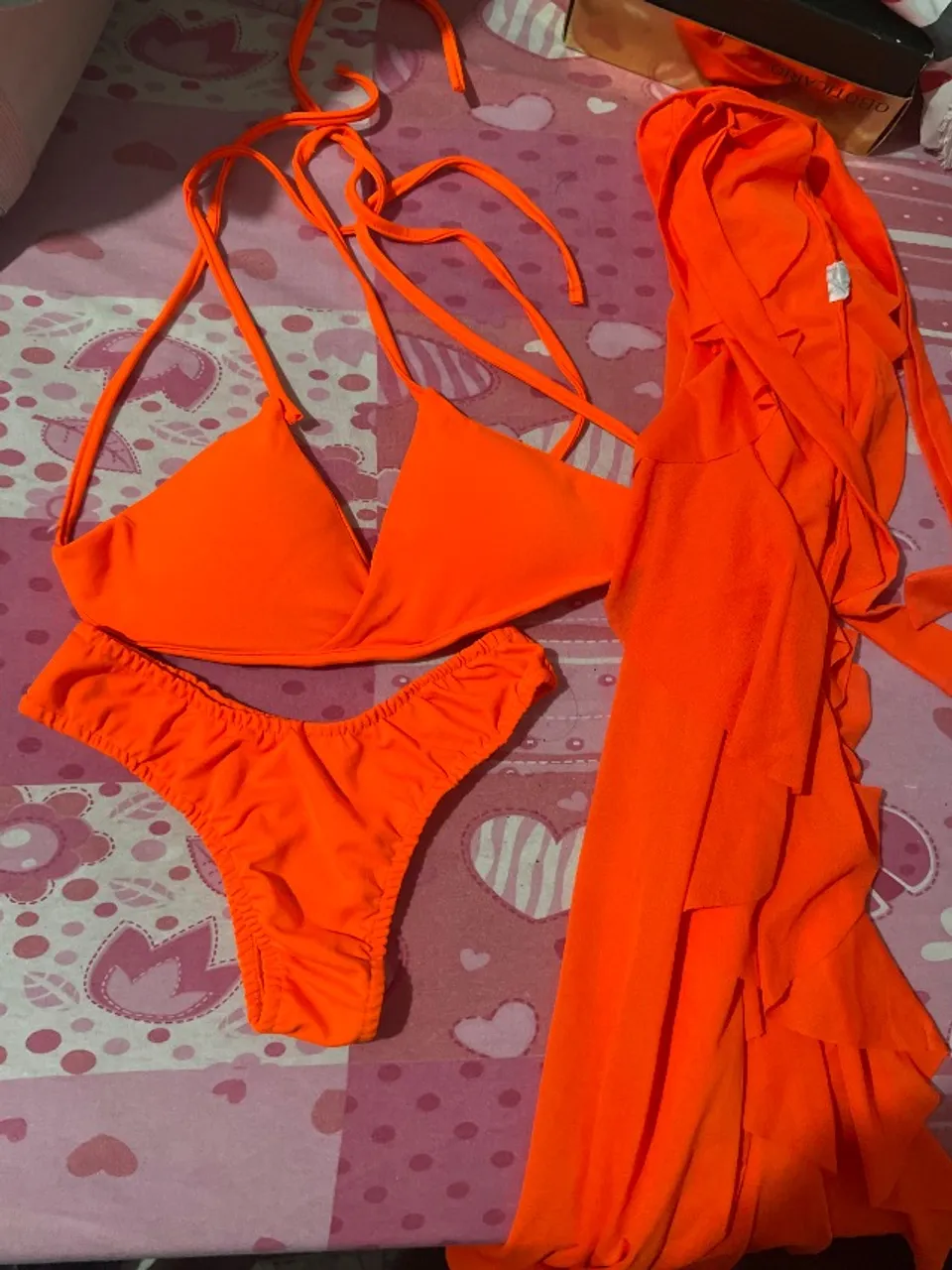Desfrute do sol com estilo! Este biquíni laranja vibrante é perfeito para um dia na praia ou piscina. Acompanha uma charmosa saída de praia para você arrasar no visual.