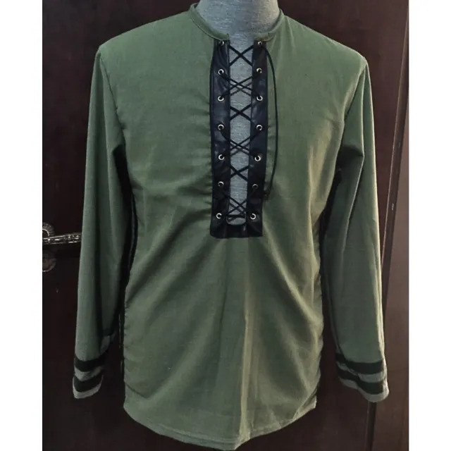 Camisa manga longa medieval verde com design moderno e detalhe em cadarço no decote e detalhes em couro no peito, mangas e laterais da camisa. Perfeita para um visual estiloso e confortável. Ideal para diversas ocasiões.