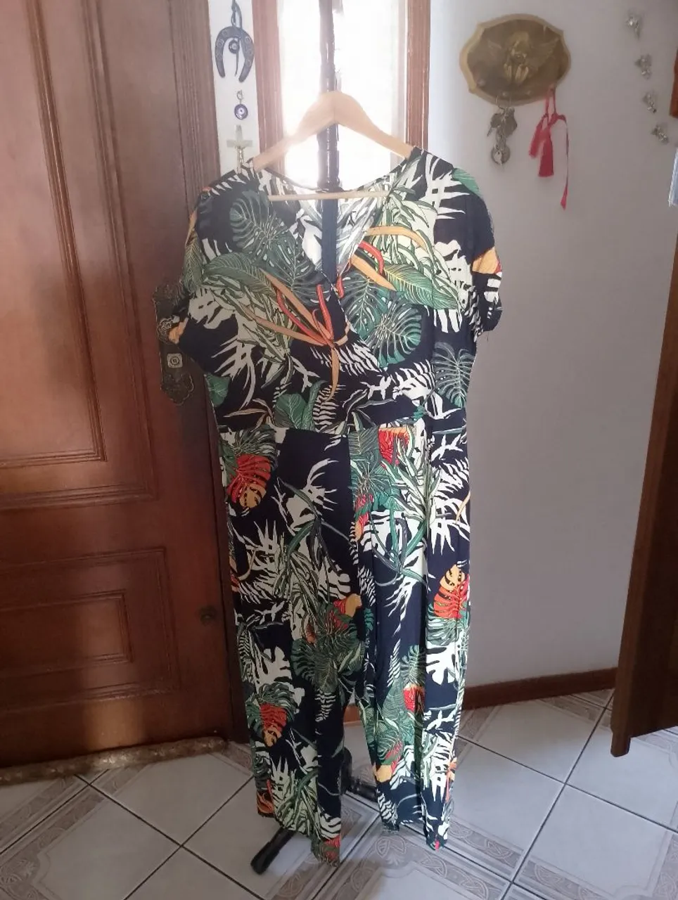 Macacão longo com estampa tropical vibrante, perfeito para um visual moderno e estiloso. Ideal para diversas ocasiões, desde passeios casuais até eventos especiais. Conforto e elegância em uma única peça. PESSOALMENTE É MUITO LINDO E DE EXCELENTE QUALIDADE E ESTADO