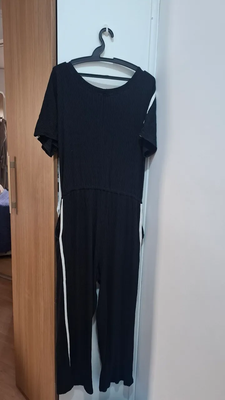 Macacão preto elegante, com caimento impecável e detalhes em branco que adicionam um toque de estilo. Ideal para diversas ocasiões, garantindo conforto e sofisticação. Tecido em viscose com elastano