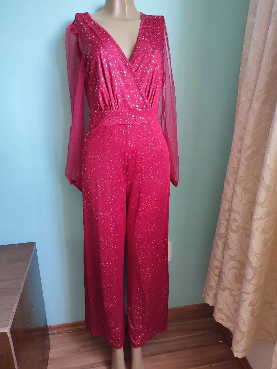 Deslumbre com este macacão vermelho vibrante, adornado com brilho sutil que captura a luz de maneira mágica. Perfeito para ocasiões especiais, este macacão combina elegância e conforto, garantindo que você se destaque com estilo e sofisticação.