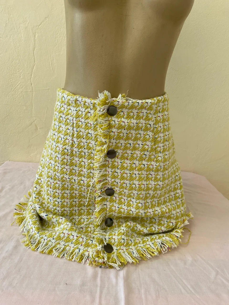 Linda saia de tweed amarela com detalhes em franjas, perfeita para um look estiloso e moderno. Super lindinha , usada só uma vez ! Marca - Bluesteel