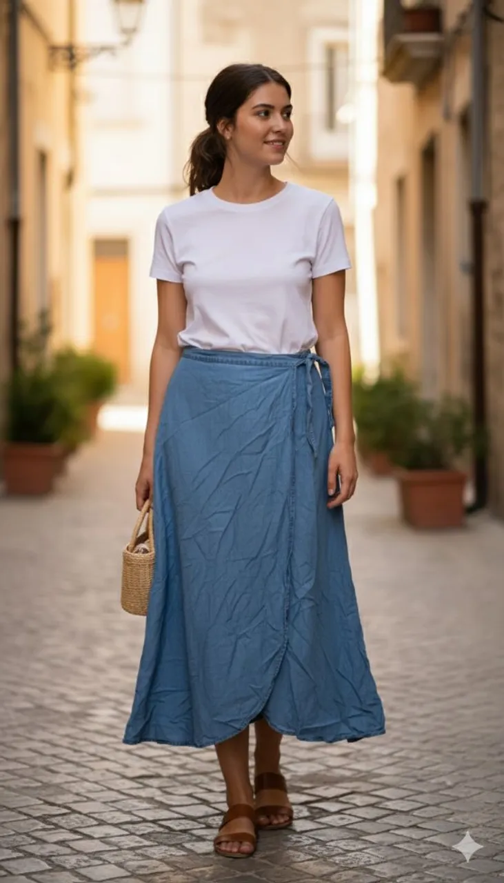 Saia jeans midi, modelo envelope, perfeita para um look casual e estiloso.