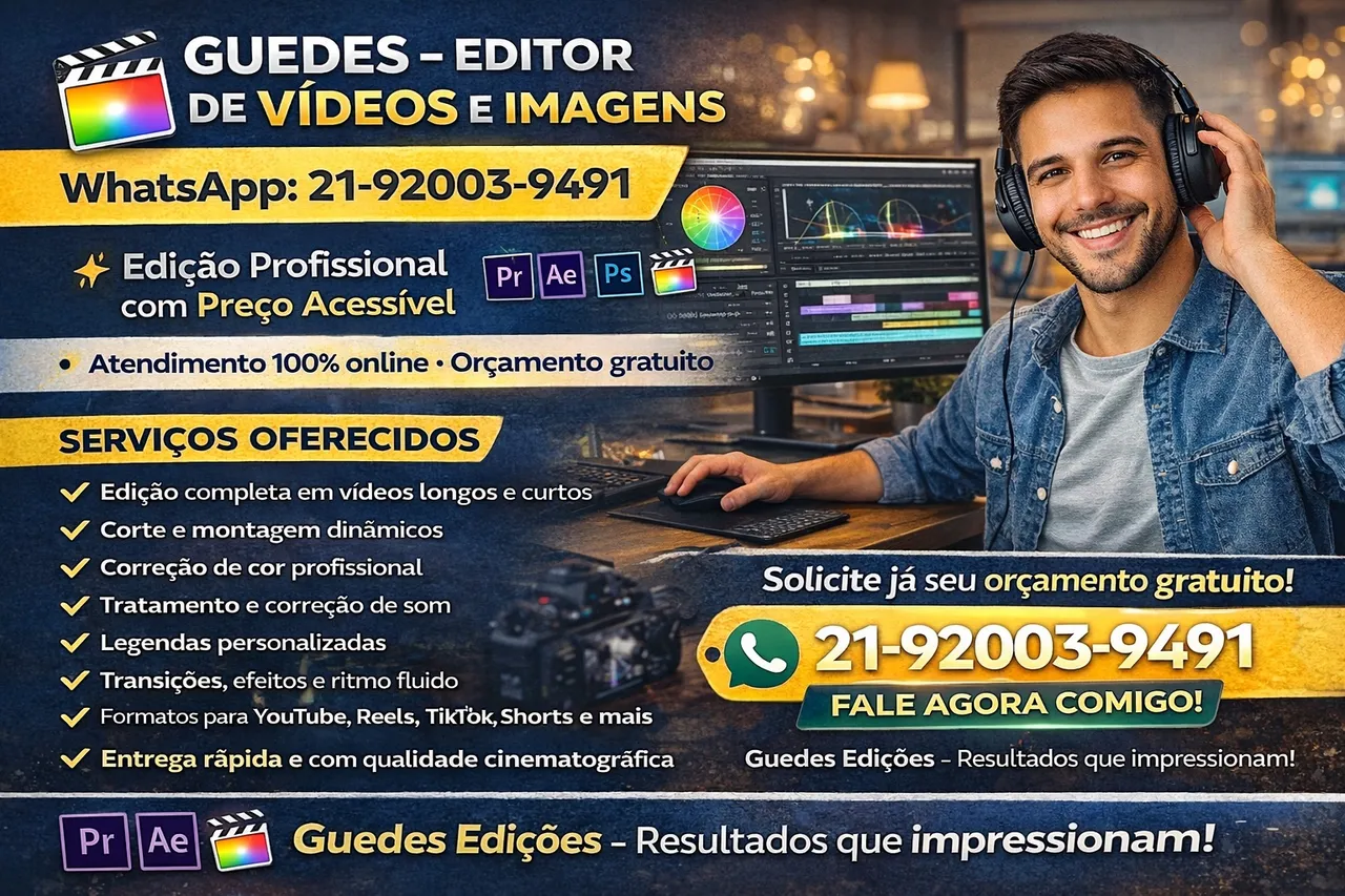 Como editor de vídeo e imagem profissional, ofereço serviços completos para dar vida à sua visão. Entendo que cada projeto é único, e meu compromisso é entregar resultados que superem suas expectativas.