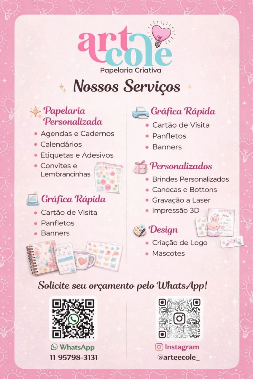 Serviços gráficos Papelaria personalizada Impressão 3d Solicitação de orçamento por WhatsApp