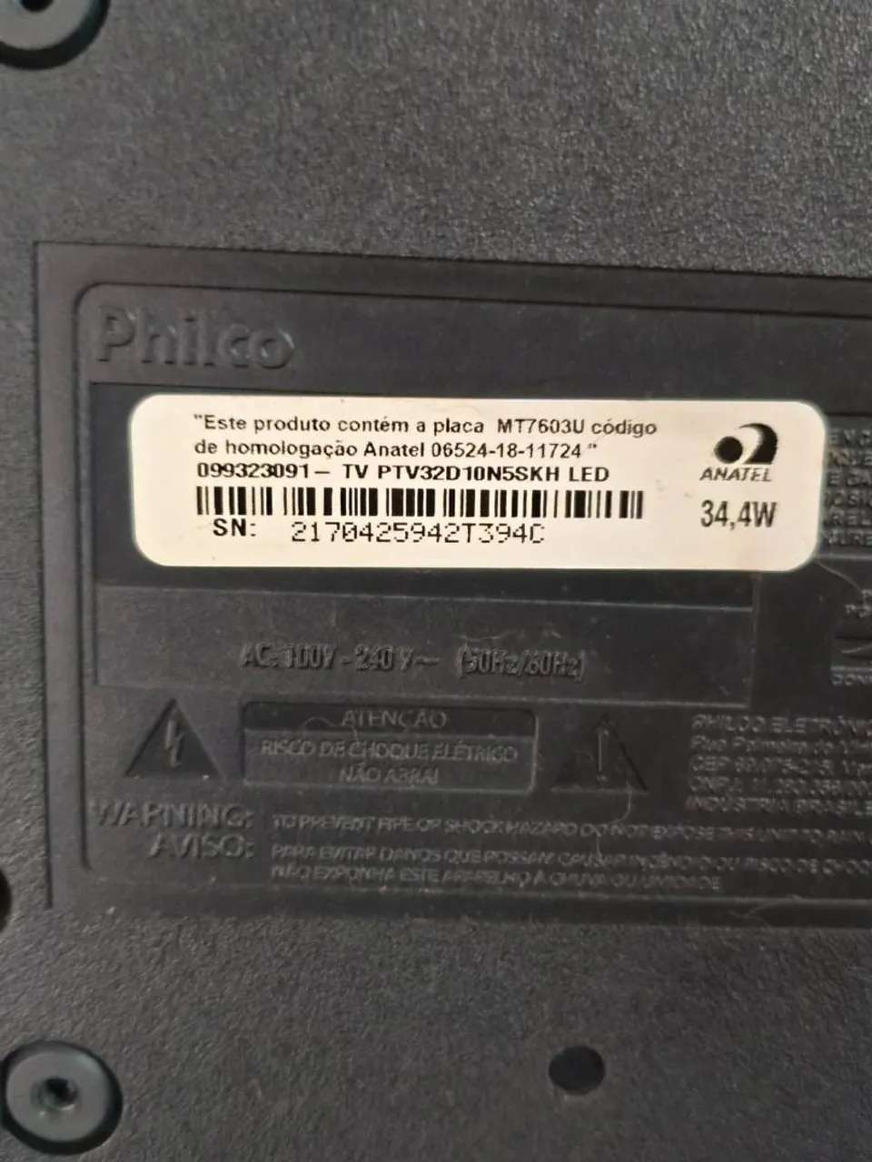 TV PTV32D10N5SKH LED, não caiu no chão, tela sem nenhuma avaria de quebrado. Parou de funcionar, ela liga da pra ver a logo da Philco e depois some a imagem e fica tudo preto. Acredito que algum componente solto. Estou vendendo pois já tinha outra. Era smart tv, funcionava wi-fi.