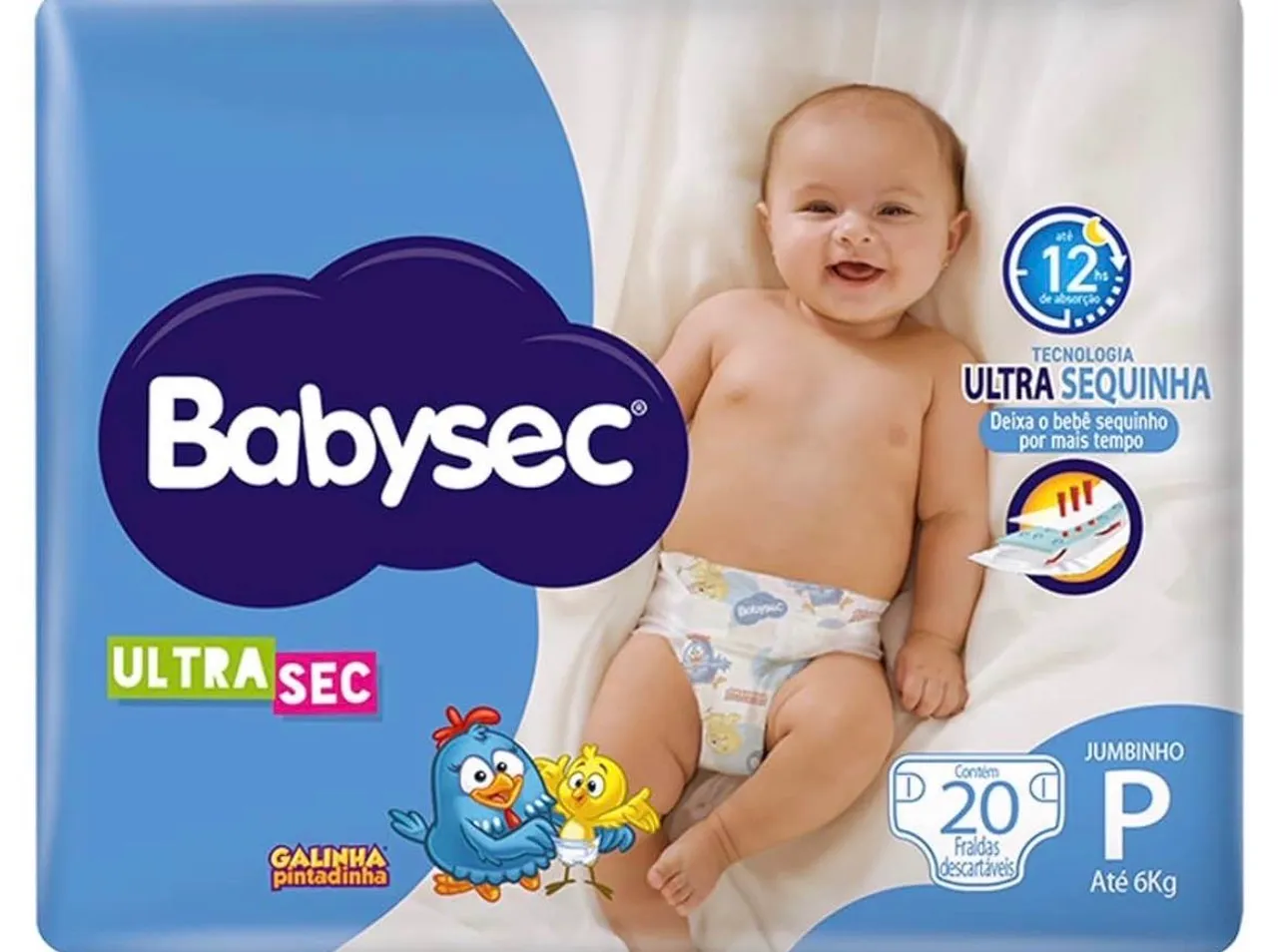 Fraldas Babysec Ultra Sec, com tecnologia ultra sequinha que proporciona até 12 horas de absorção. Contém 20 fraldas descartáveis, tamanho P, ideal para bebês de até 6kg.