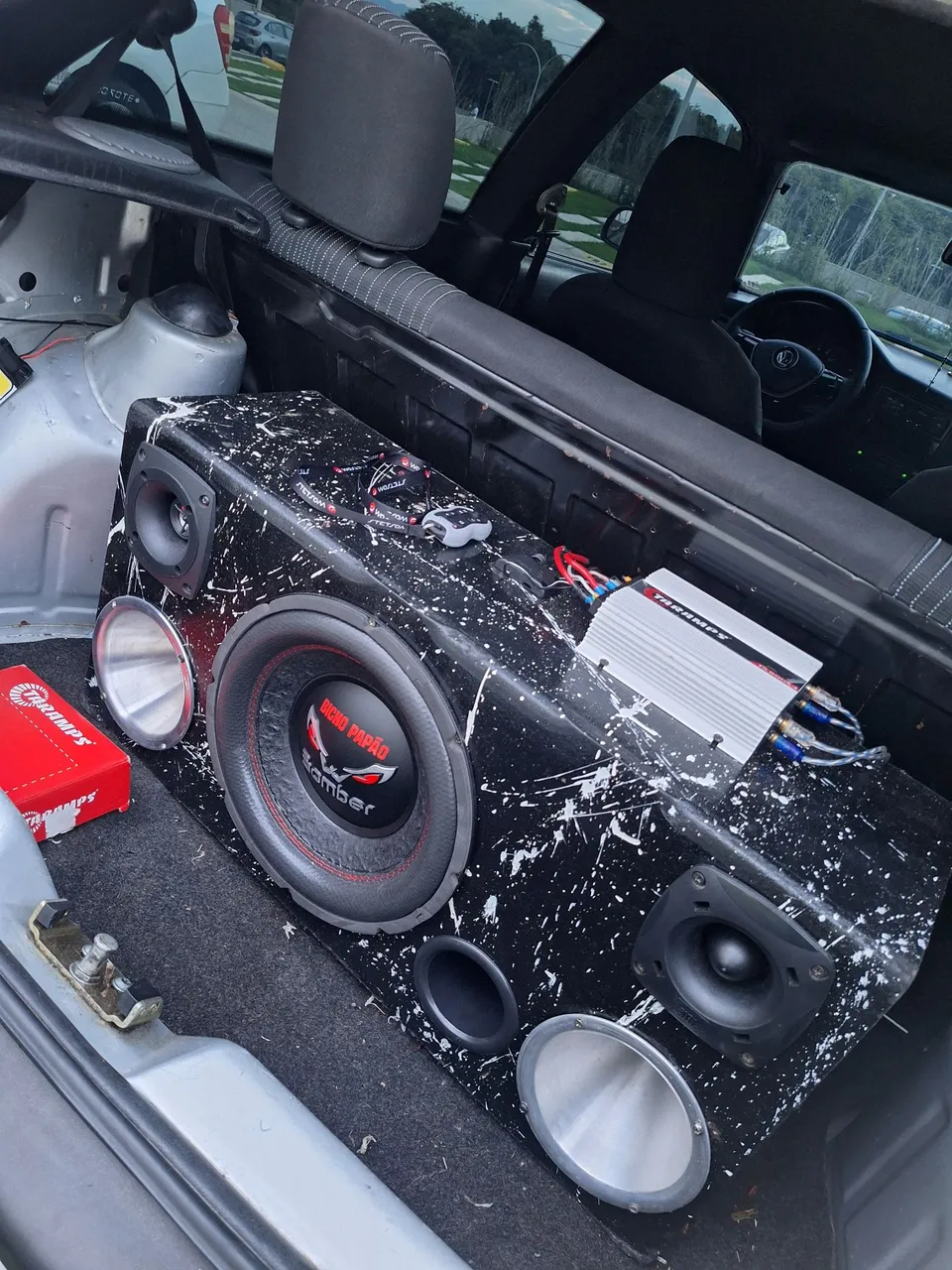 caixa super trio subwoofer 12 polegadas 1200w 8ohms D250x JBL cone de alumínio ST200 JBL corneta 100w cone de alumínio Tweeter 100w Taramps TS800X4 controle longa distância sx1 stetsom Cabo RCA 5m blindado e 2 Y blindado