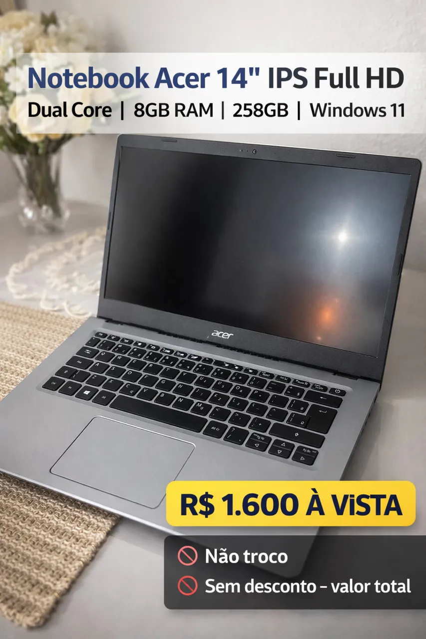 Vendo Notebook Acer 14 polegadas, com tela IPS Full HD, em ótimo estado e funcionando perfeitamente.