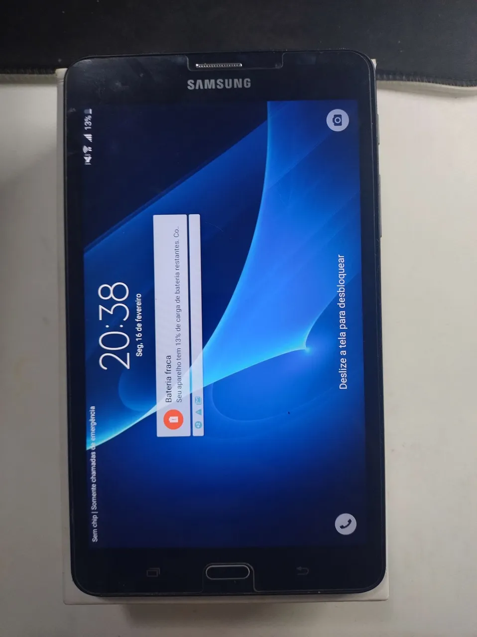 Vendo tablet Samsung Galaxy A6 2016 em perfeitas condições com caixa original. Contém 8 gigas de espaço de armazenamento, aceita chip SIM 4G e cartão de memória. Acompanha uma capa inclusa e película já aplicada.