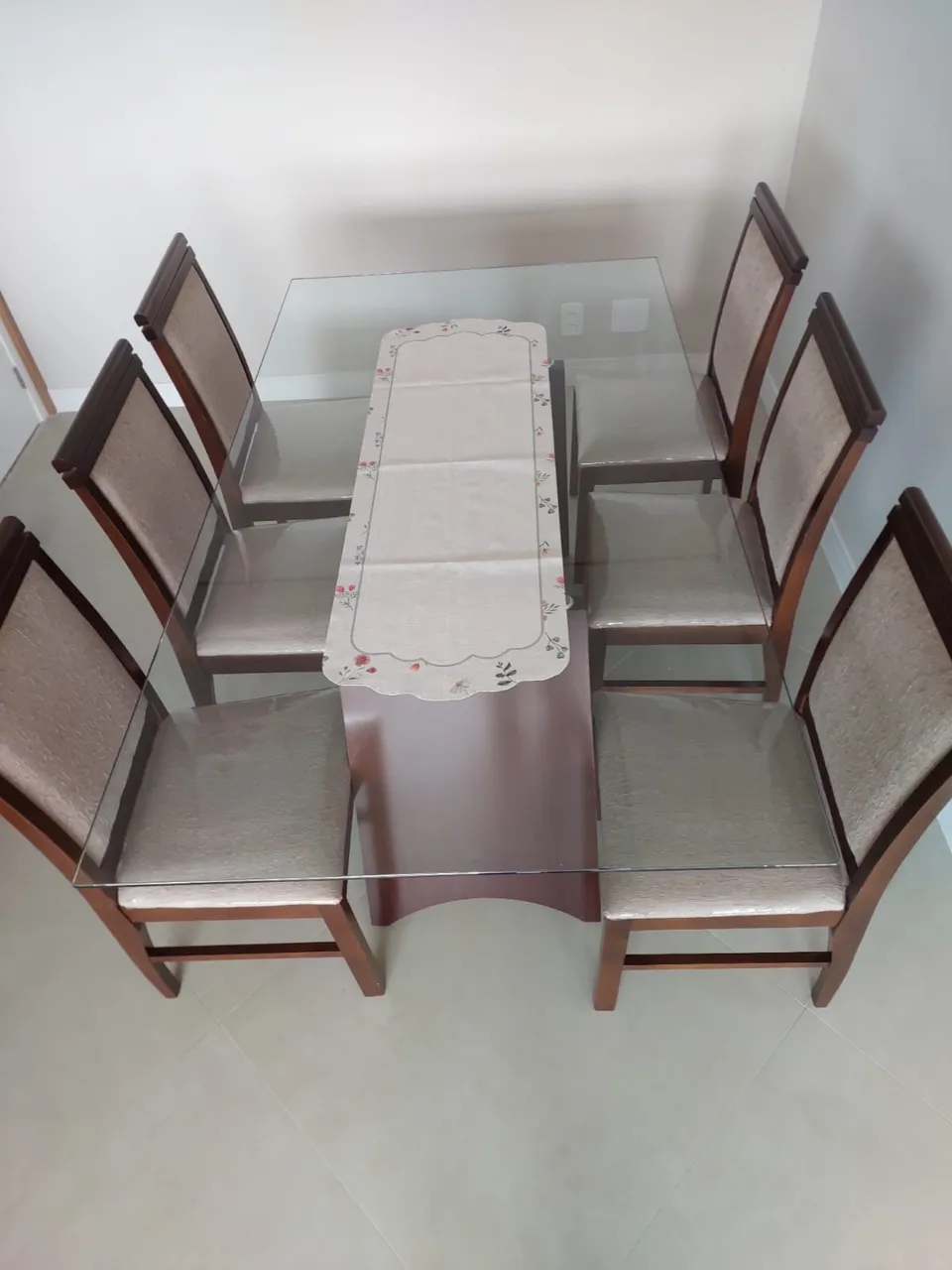Estrutura firme, vidro sem riscos e cadeiras com estofado conservado.