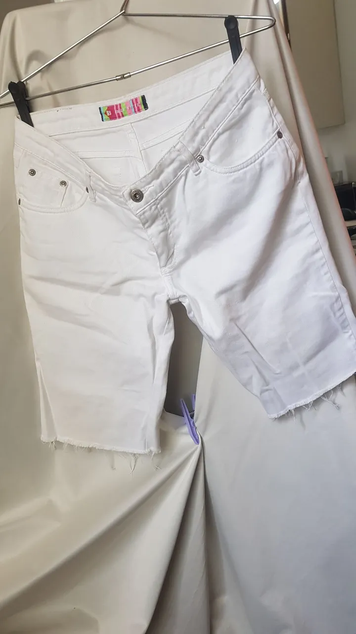 Shorts jeans branco, ideal para compor looks casuais e estilosos. Uma peça versátil e confortável para o seu dia a dia. Veste 40-42